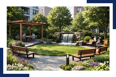 • Projektowanie kameralnych form zieleni publicznej, w tym tzw. parków kieszonkowych, stanowiących funkcjonalne i estetyczne uzupełnienie tkanki miejskiej;